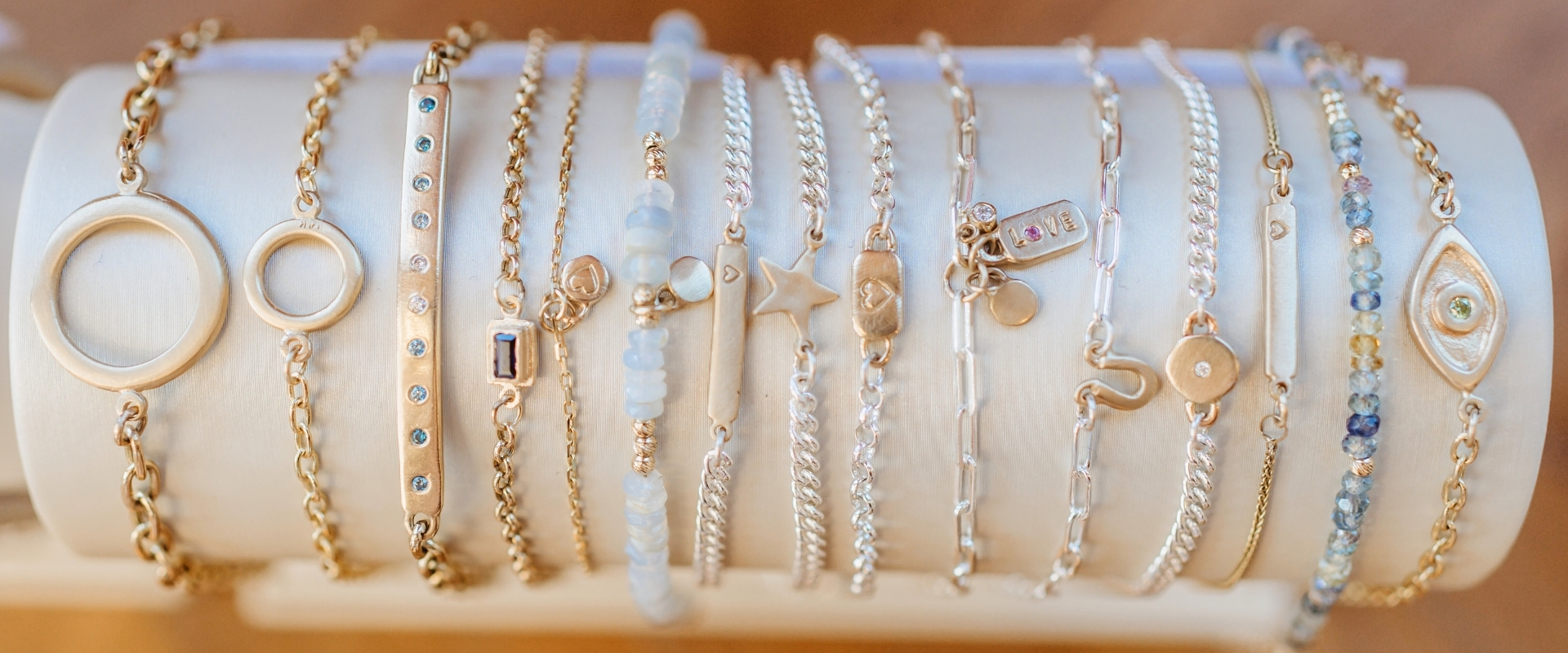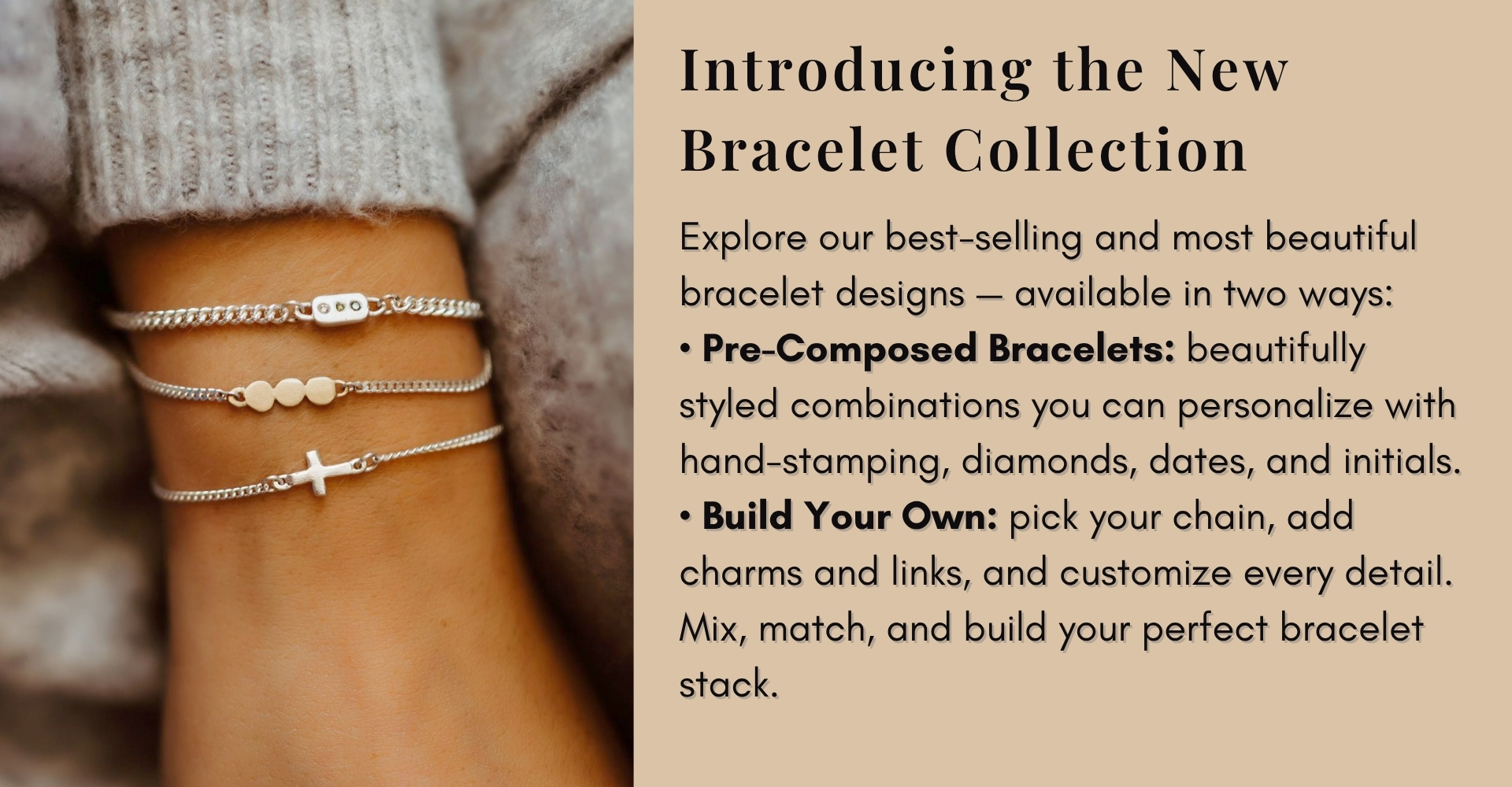 Quick view Build Your Own Silver and Mixed Metal Chain Bracelets A bracelet designed by you and handcrafted by us.Select your chain, mix and match charms, add meaningful symbols, birthstones, diamonds, or hand-stamped words — and we’ll build your bracelet exactly the way you envision it.Each one is made to... Now $75.00 Price Was